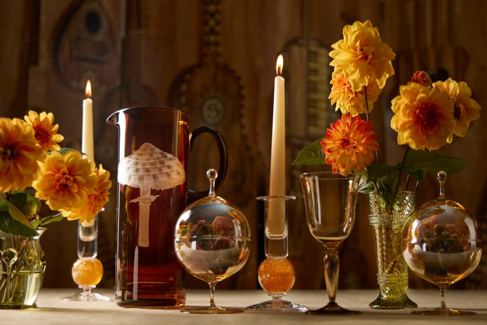 As the meal progresses, Sheridan says, “I like to embrace the theatre of carving and bring out my hand-forged Ben Bodman carving set.” Decorative items also have a place at the table – ABASK has a Czech jewelled Christmas tree from the 1930s that would make a wonderful centrepiece. Or source dramatic jugs and vases from vintage markets.