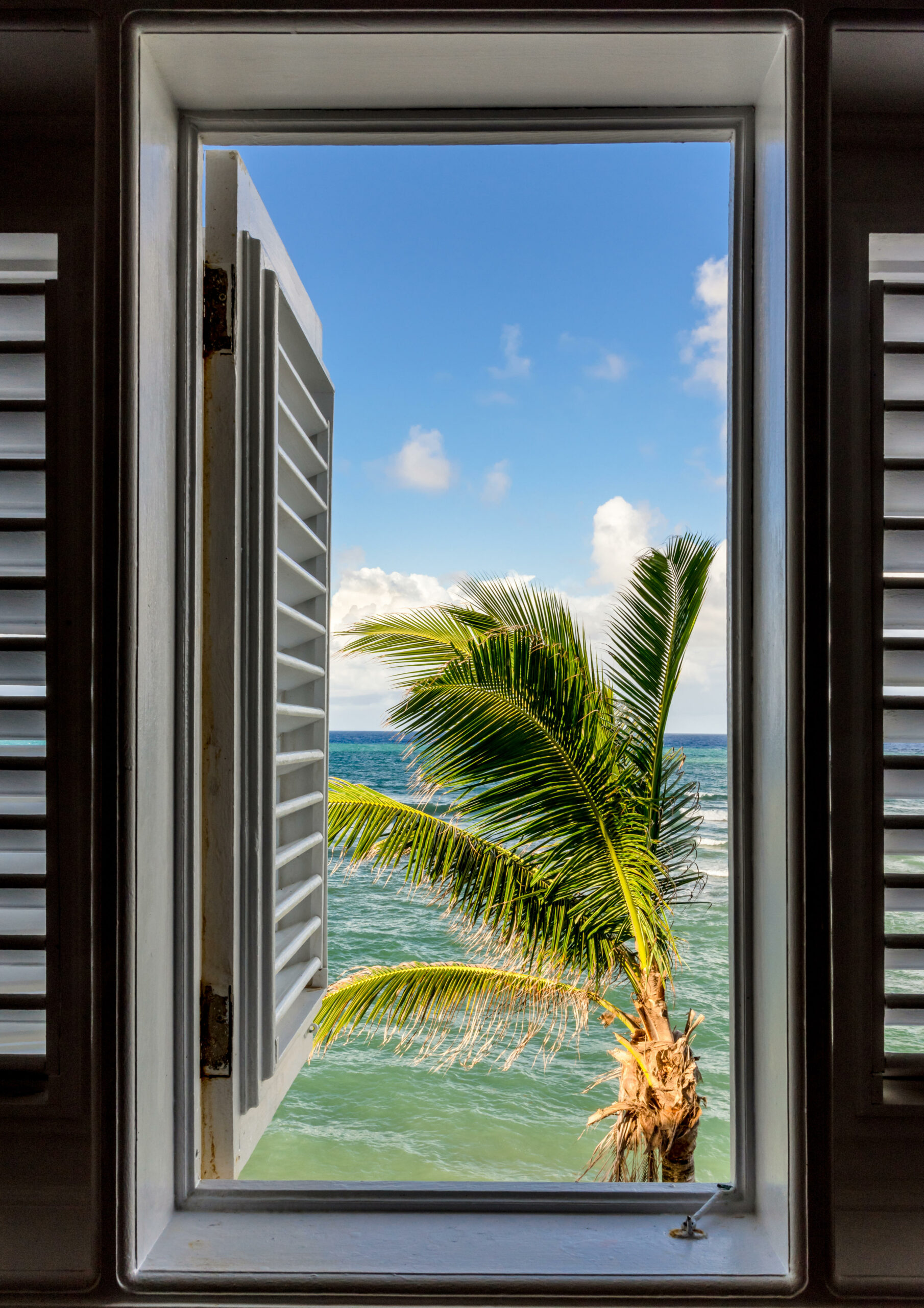 Pictures from top: at the beach in Barbados (Alamy); a palm tree seen through a shuttered window (Alamy)