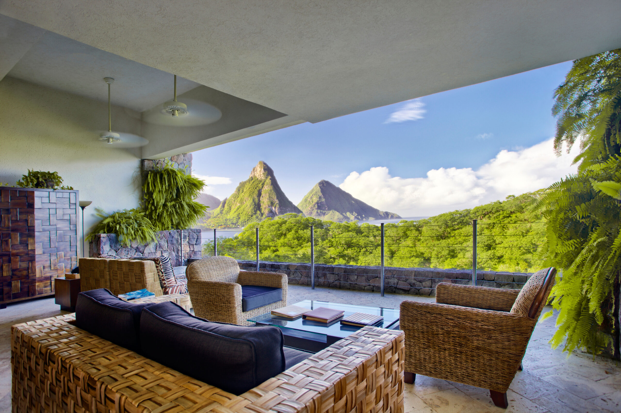 Pictures from top: a serene bathroom (unsplash); bringing the outside in with a green wall and views onto a plant-filled garden (Getty); muted tones and textures in a calm sitting room (Getty); natural materials in this walk-in shower with a skylight and living wall (Getty); taking open-plan one step further by removing the external wall for views of the Pitons in St Lucia (Alamy)