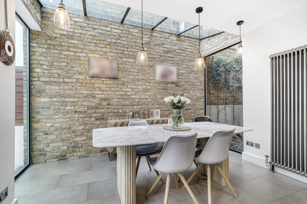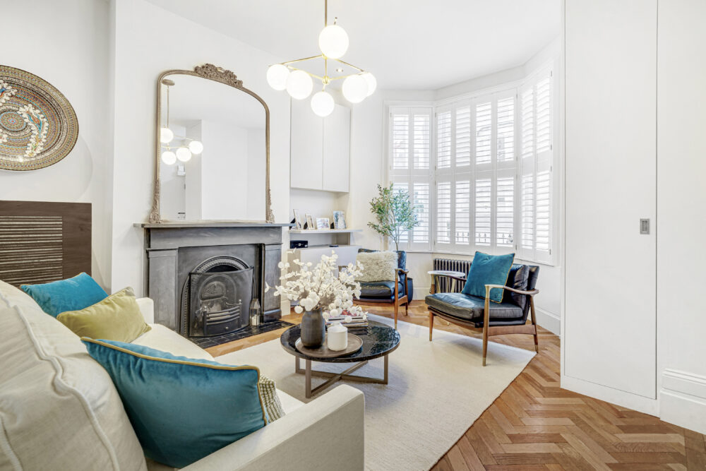 Upon entering, you are welcomed by a spacious double reception room, featuring a charming original fireplace and exquisite herringbone parquet flooring that ties together the bright, open space. Traditional double-height French doors at the rear floods the room with light.