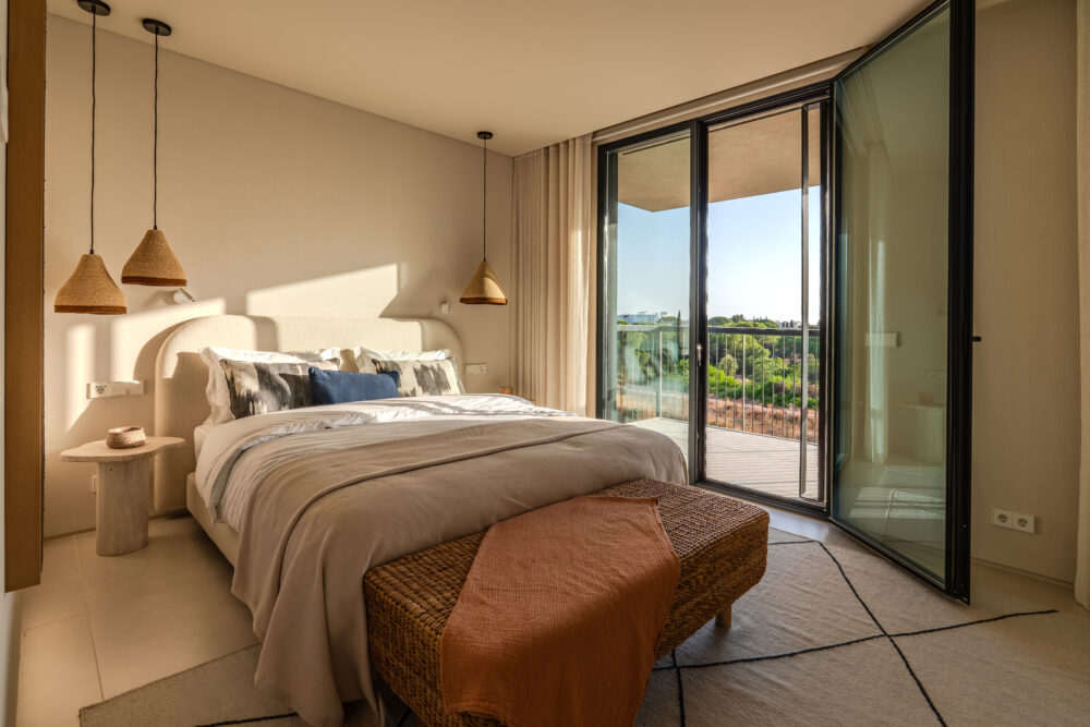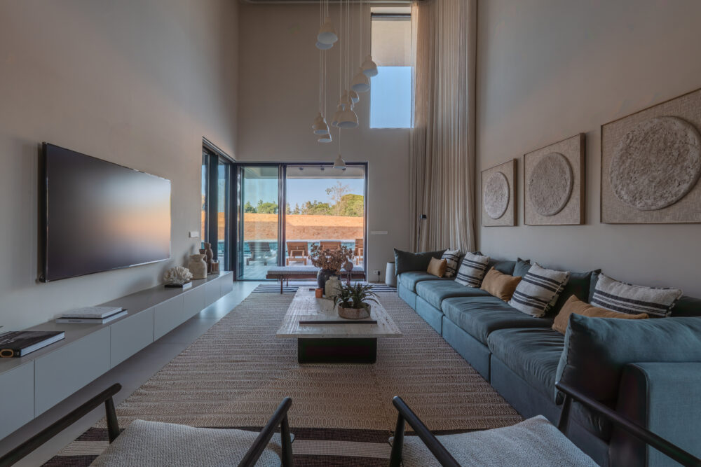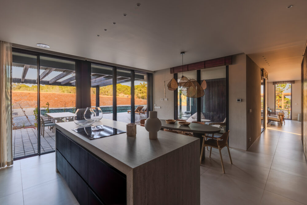The Sand Villa pairs minimalist design with soft tones and bold architecture, featuring sloped gardens that create a seamless, immersive connection to nature.