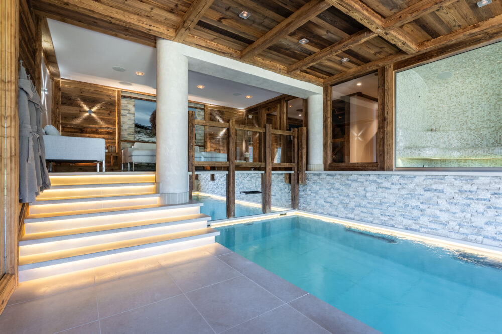 Unique property in Courchevel with excellent amenities, offering panoramic views of the surrounding valleys and peaks.