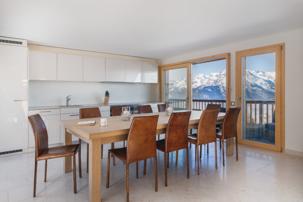 A spacious open-plan kitchen, fully fitted and equipped, flows seamlessly into the dining area, which features a large family table and an elegant glass-and-stone fireplace interconnecting with the living space. Expansive floor-to-ceiling windows and doors allow guests to take in the spectacular, far-reaching views of the mountains and the valley beyond.