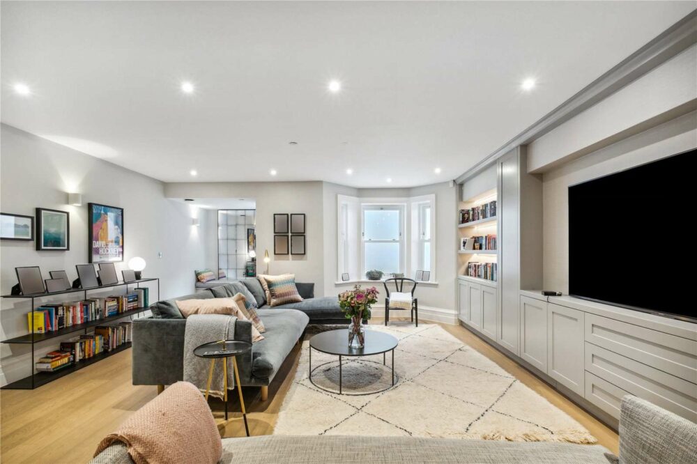 The lower ground floor benefits from good natural light and comprises a large family room with excellent contemporary cabinetry housing the Audio Visual equipment and offers useful display shelving. To the rear is an integral garage with electrically operated gates.