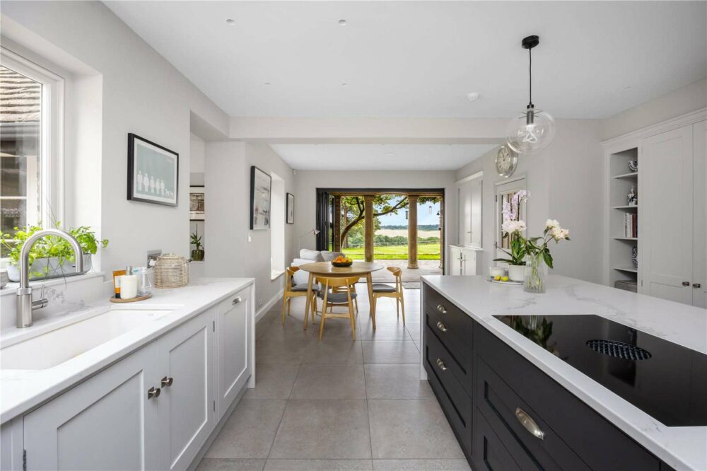 The spacious principal reception rooms are ideally suited to formal use, being elegant and comfortable. The grand dining hall has French doors to the rear terrace and a large stone fireplace; a pair of oak pocket doors open up to the triple aspect drawing room, a superb room with partial oak panelling, a grand fireplace and French doors to the rear terrace. A study, which could be used as a home office, lies off the side hallway, which leads past the cloakroom and pantry. The kitchen/breakfast room is open plan, and has underfloor heating and bi-fold doors to the loggia; it leads on to a side entrance hall and a TV/ family room, ideally suited to day-to-day modern life.