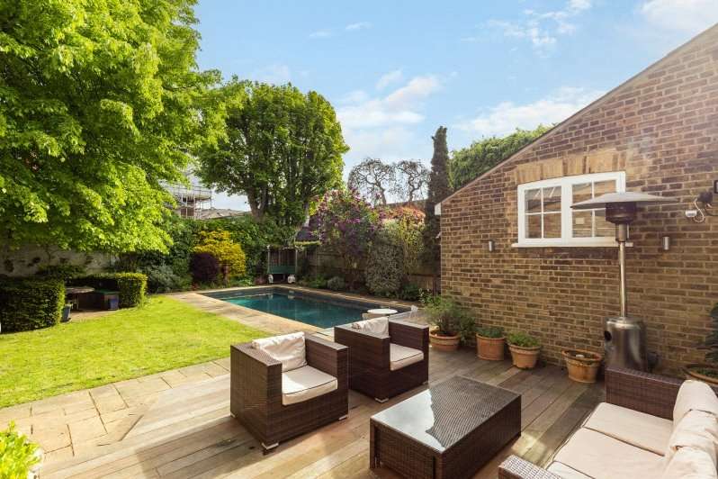 To the front is an impressive bay fronted double width reception room with a pretty window seat, built in surround sound and an attractive period fireplace. Two sets of French windows with original shutters lead to an elegant conservatory dining room, accessible from both the kitchen and the reception room. This beautiful dining space opens onto a decked terrace overlooking a well maintained mature rear garden with a superb outdoor pool with heavy duty Aquqguard safety cover and power “swim jet.” All the pool machinery is stored in the brick outbuilding. A large study/TV area is located alongside with easy access to the garden and pool. A bespoke kitchen/breakfast area with a vaulted ceiling offers an extensive range of units and cupboards with stone work surfaces, and fully integrated appliances.