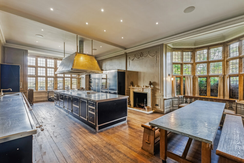 The accommodation is beautifully proportioned throughout. The welcoming reception hall provides an immediate sense of space and grandeur. To the front of the house lies a magnificent ballroom, an exceptional entertaining space with a high ceiling, bay windows and an open fireplace, flooding the room with natural light. Adjacent is a further reception room, ideal as a study, snug or informal sitting room. At the heart of the home is a bespoke, state-of-the-art kitchen, fitted with custom cabinetry, twin gas ovens and a generous dining and seating area, perfectly designed for modern family living.
