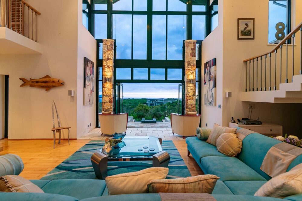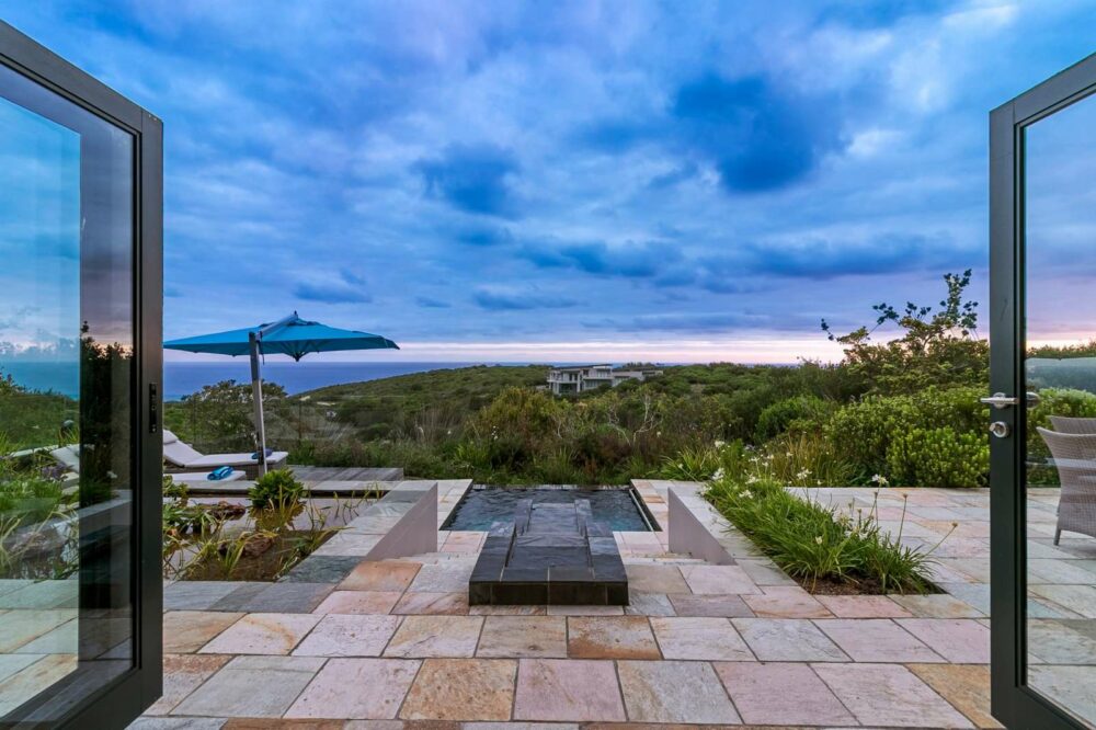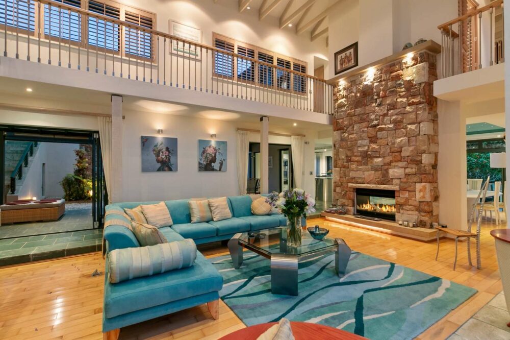The entrance is approached through double glass entrance doors. With an impressive, cantilevered staircase with steel uprights around a feature wall with unique plaster finish. The double-volume living areas showcase the breathtaking vistas and open onto a deck on the east-south side, leading to a water feature pool – perfect for a refreshing splash or your own water aerobics.