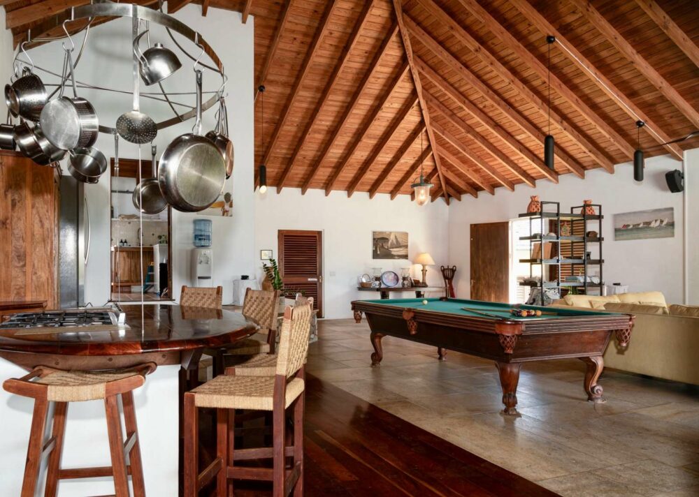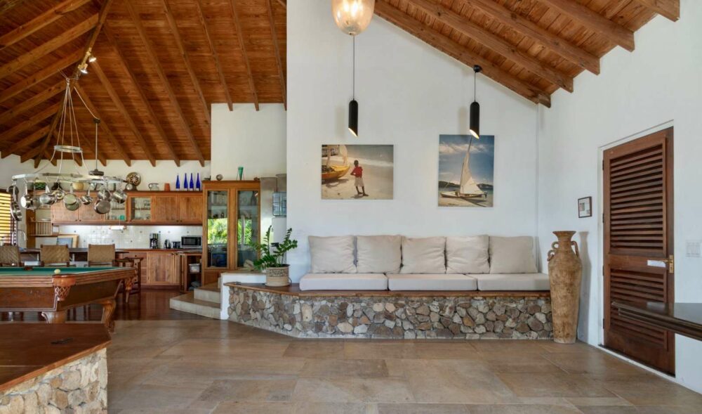 The living area, the heart of the house, accented with Trinidadian mahogany beams, and natural limestone floors, flows effortlessly onto the expansive verandah.