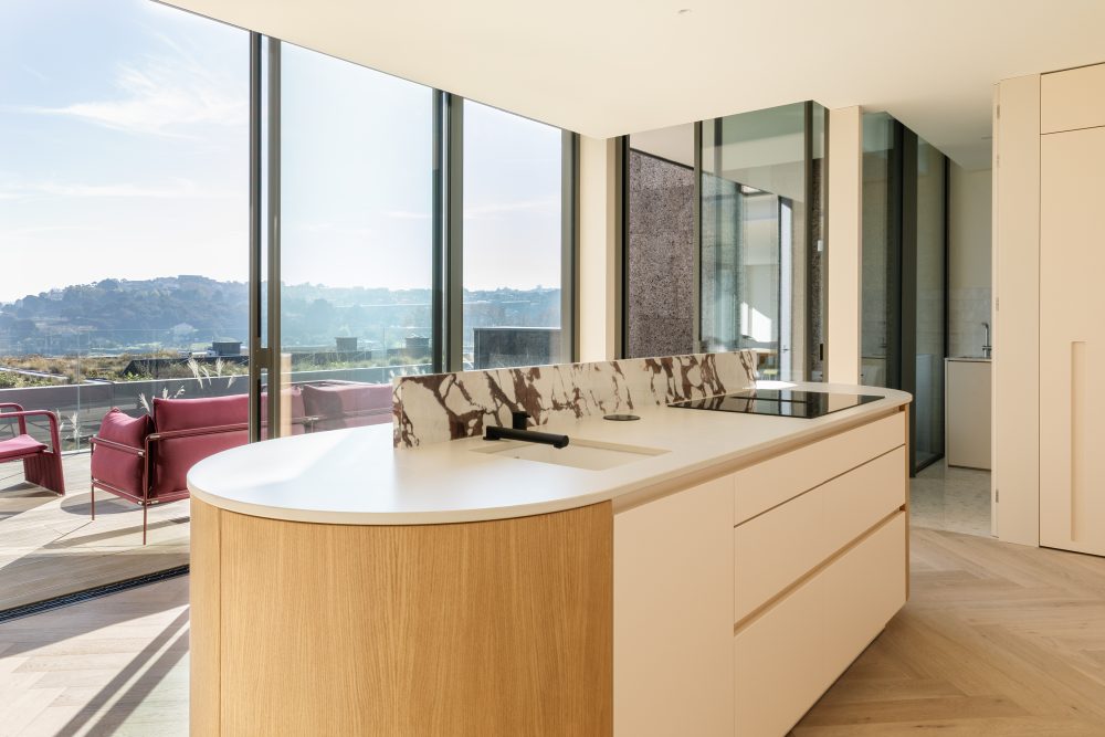 The first floor is entirely dedicated to the social area with a functional layout. The modern fully equipped kitchen includes a central island and direct connection to the dining area. The spacious and bright living room opens onto the exterior through large glazed openings, creating a connection to the the balconies and the landscaped patio, ideal for outdoor leisure and social moments. This floor also includes a guest bathroom and a laundry area.
