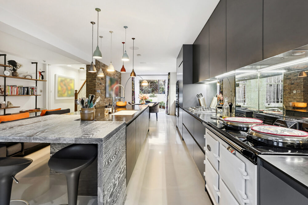 Set back from the road, it features an elevated private terrace, perfect for enjoying the unique waterfront lifestyle. Period details blend seamlessly with modern finishes, creating light-filled spaces in an enviable riverside setting. The lower ground floor presents a spectacular open-plan entertaining space with a bespoke kitchen, complete with a feature Aga and premium Gaggenau’ appliances. Beyond the generous dining area, double doors open onto a lower patio ideal for al fresco dining. This level also includes a separate utility room with secondary access to the front of the house and a cloakroom. On the raised ground floor, a beautifully proportioned double reception room is flooded with natural light, boasting breathtaking river views to the front and overlooking the landscaped garden to the rear. A cloakroom completes this level.