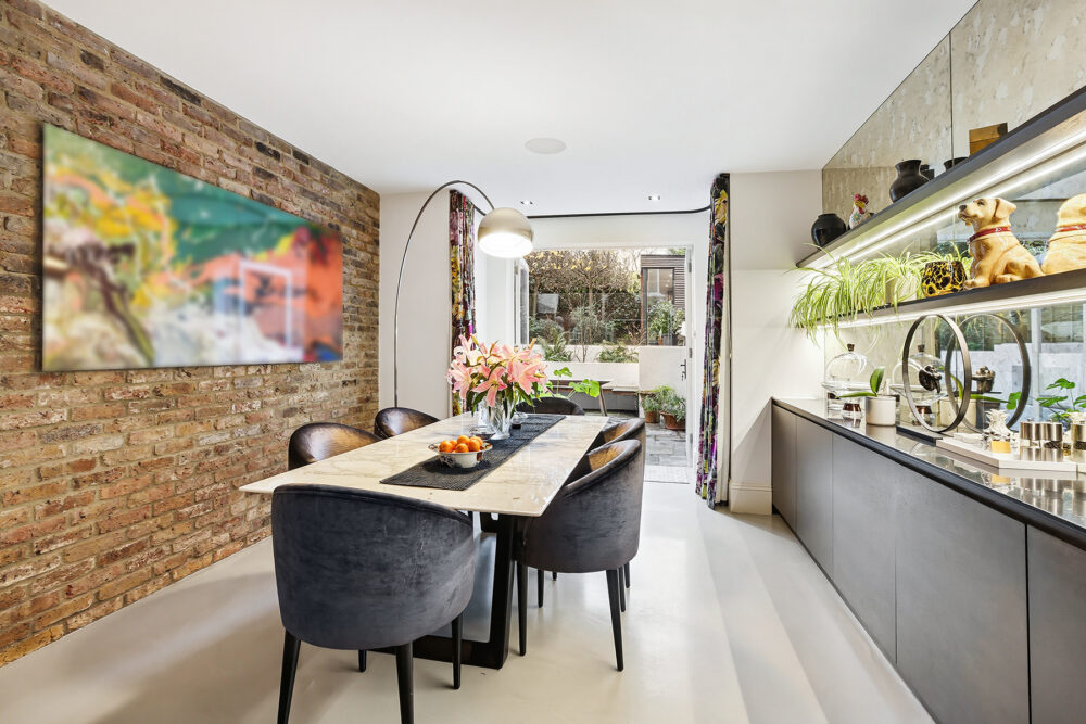The first floor has been transformed into an opulent principal suite featuring a luxurious en suite bathroom and a bespoke-fitted dressing room, with flexibility to revert to a fourth bedroom if desired.