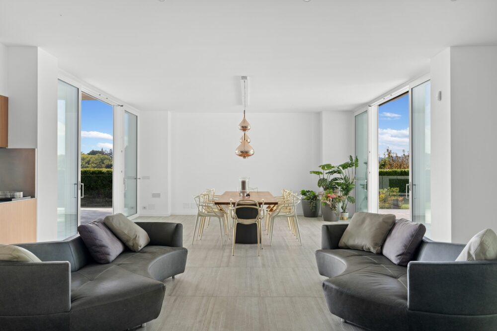 Entering the villa, through the raised ground floor into a stunning triple height entrance hall leading to expansive living spaces, including a split level reception room with direct access to the garden, an open plan chef designer kitchen, a large walk-in coat and boot room, a guest bathroom and a media room. A seamless indoor-outdoor flow to the terraces, garden and a spectacular infinity swimming pool. On the same floor recessed from the living room areas, lies the master bedroom space with a dressing room and ensuite bathroom. The upper floor is reached through a staircase under the large glass roof panels. Four double bedrooms, each with walk in walk in wardrobes. Two bathrooms, a sitting room and two large terraces. The lower ground floor features a guest/staff apartment composed of a living room with fitted large open plan kitchen, a bedroom and a bathroom. On the same floor there is a large gym, a marble steam room, a bathroom, a laundry room, a cellar and technical rooms. The architectural profile of the villa is in synergy with the energy efficiency and innovative technical solution providing the perfect internal temperature and clean air.